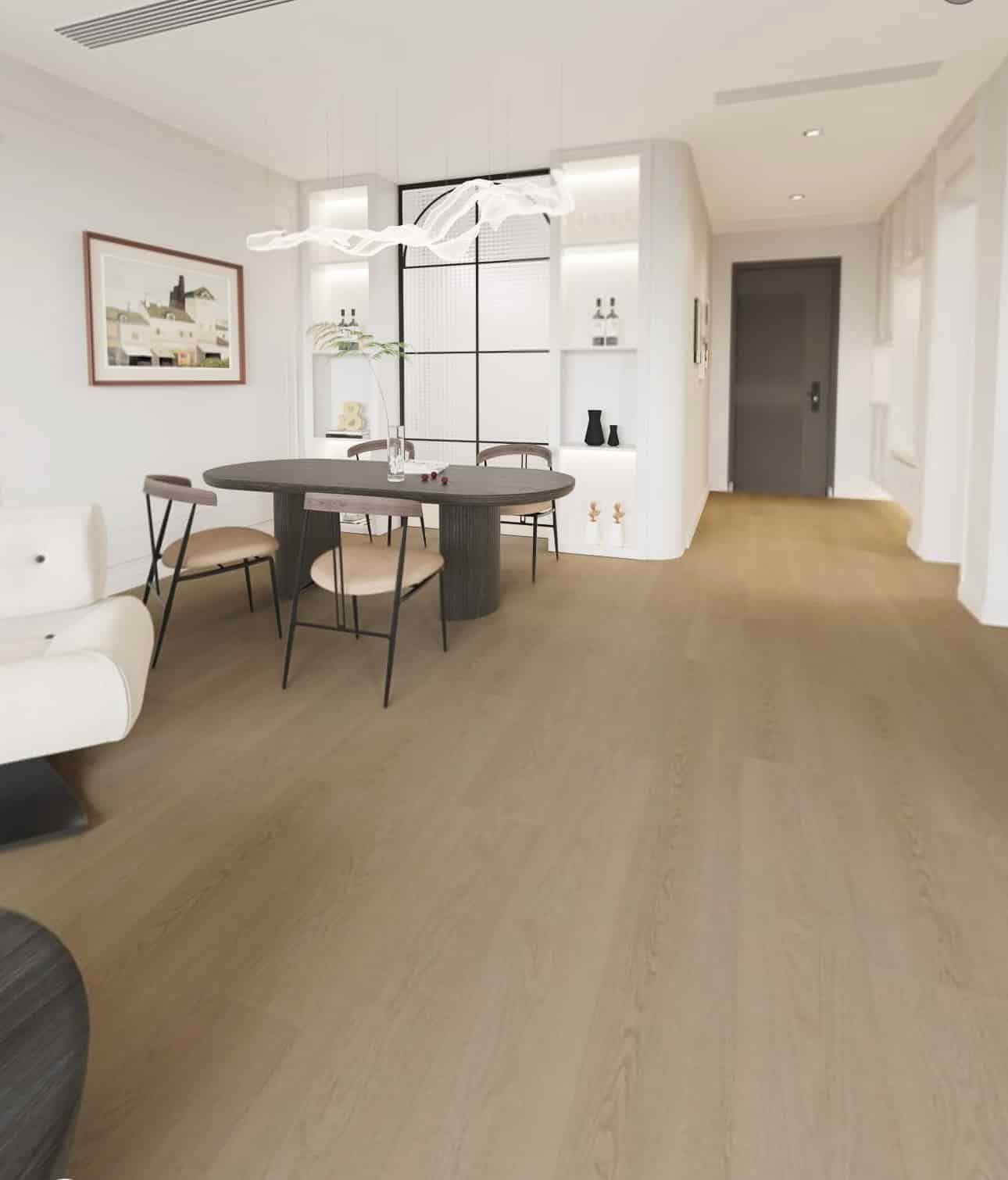 解决了技术层面的忧虑,屋主们最关心的就是家里变漂亮。现在的装修趋势已经从那种很生硬的“假木头”感,进化到了追求自然原木的触感。很多追求质感的朋友会选择带有同步压纹(EIR)技术的系列,比如深受年轻屋主喜爱的 SPC Celestial Plus 地板,这种地板的纹理能跟视觉图案完全重合,摸上去就像真的原木一样,非常高级。